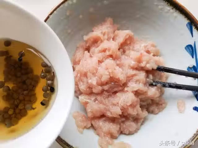 5、一勺玉米澱粉用冷水化開後少量多次加入,順一個方向攪拌均勻,最後放入適量花生油,再用手抓起魚肉摔打幾下,可以讓魚肉更加勁道。魚肉變得細膩有光澤,體積比最初要膨脹很多。