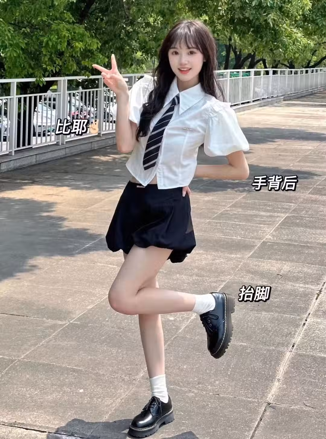 說到苗條顯瘦的角度,側身是很值得一試的,身體稍側,45度最佳,靠近鏡頭的腿屈膝抬起,一手放背後,一手比耶,姿勢雖然簡約,但拍照不僅顯瘦也很自然,富有生活感。