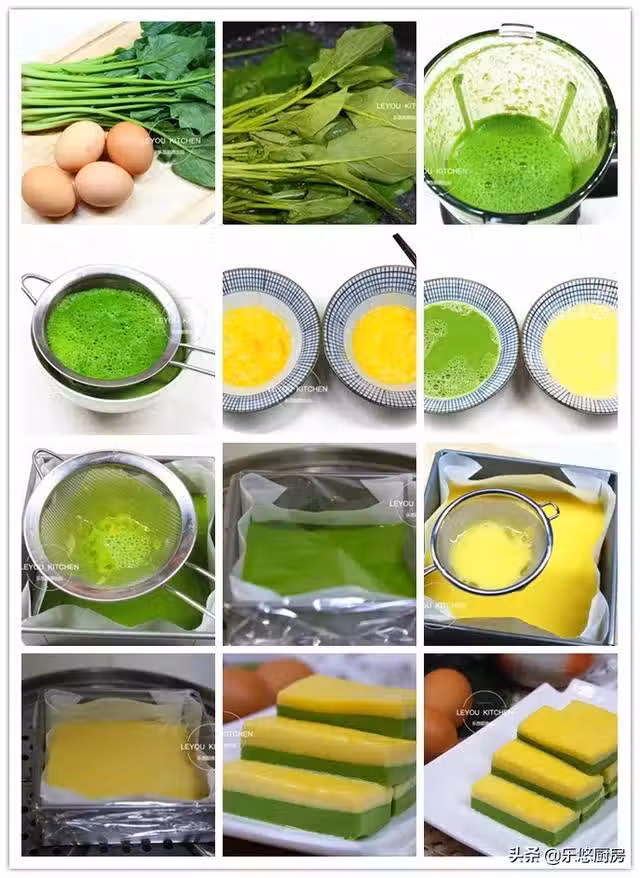 第九步:蒸好後取出,把保鮮膜打開,將另外一碗蛋液篩入裝有菠菜蛋羹的模具中,如圖。