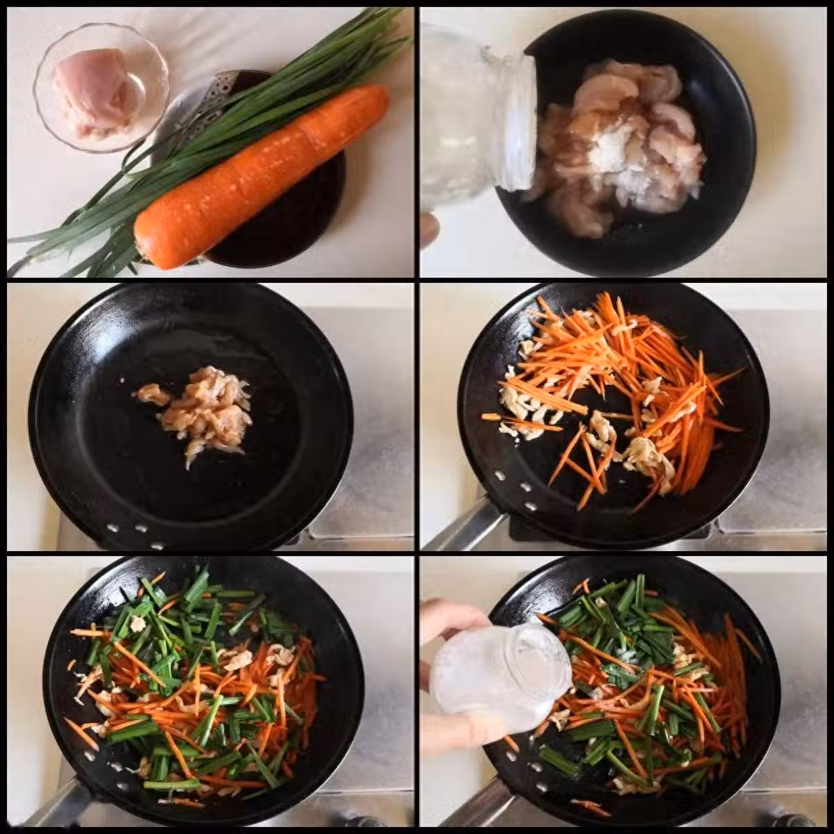 小貼士:1. 雞脯肉切成絲後加入鹽等調味料拌均勻腌制一下; 2. 先用少許油煸炒雞肉絲, 再加入胡蘿蔔絲翻炒,這樣更利於胡蘿蔔素的吸收; 3. 韭菜很容易熟, 韭菜變色後加入鹽等調味即可。