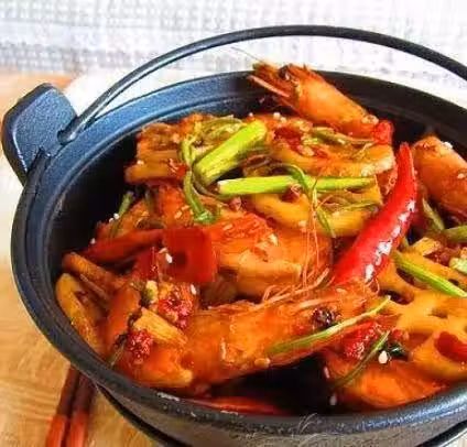 把鮮蝦用剪刀沿著頭部剪開,用牙籤挑出蝦線,剪掉過長的蝦須。用料酒兩勺腌制十分鐘。控干備用起油鍋,倒入蝦,大火炸到皮脆馬上撈出控干香芹香菜都切段兒,藕片洗凈控干起油鍋,放入蔥姜蒜末煸炒出香味,放入麻椒一小把煸炒放入紅油郫縣豆瓣醬煸炒放入白糖,雞精放入蔬菜急火快速翻炒放入炸好的紅辣椒翻炒,最後倒入炸好的蝦,放入熟芝麻翻炒出鍋