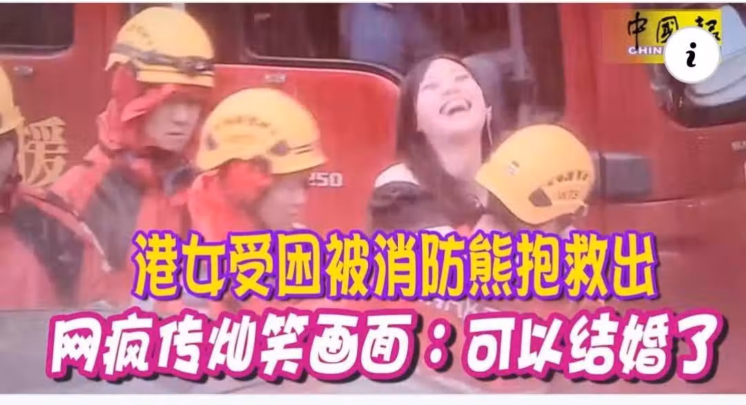港女受困被消防熊抱救出 網瘋傳燦笑畫面:可以結婚了