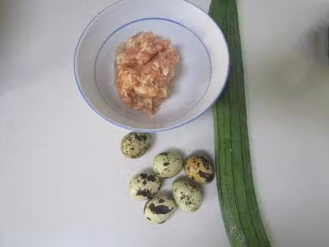 1.豬肉末里加入1克鹽,黃酒和少許蛋清按順時針方向攪拌至有粘性為止,備好鵪鶉蛋和絲瓜