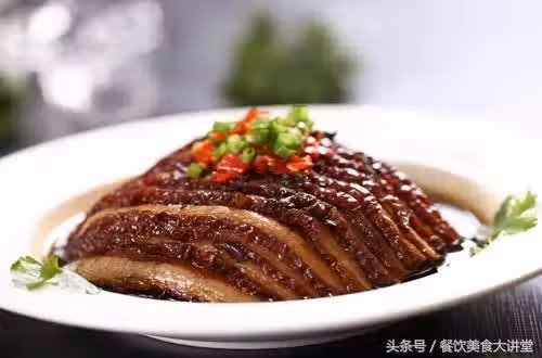 4、把炒好的梅菜覆蓋在肉上,上籠屜用旺火蒸1小時。把蒸菜的汁倒出,將梅菜扣肉倒扣進盤裡。原汁加入少量澱粉勾芡,淋在肉上就可以了。