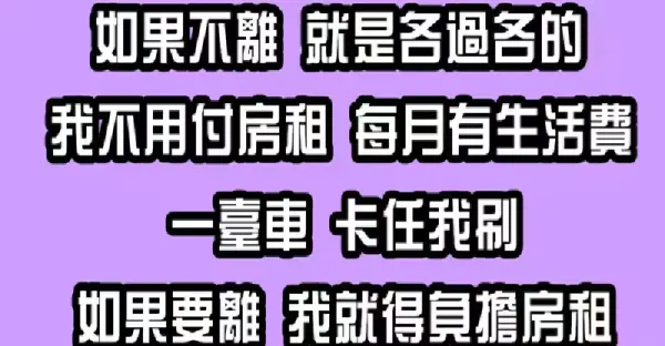 老公外遇一年了,在外面跟小三住,我卻遲遲無法決定離婚... 如果不離,就是各過各的,我不用付房租,每月有生活費、一台車、卡任我刷;如果要離,我就得負擔房租、車貸,但能擺脫爛關係,希望廣大網友幫忙給意見