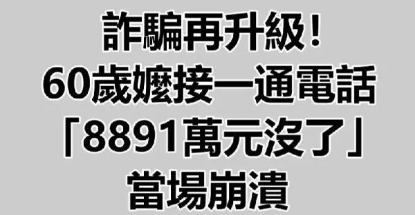 詐騙再升級!60歲嬤接一通電話「8891萬元沒了」當場崩潰