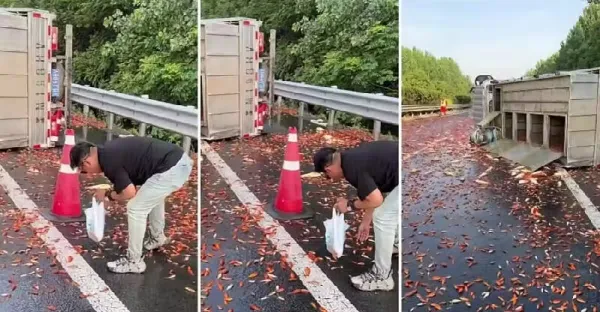 貨車高速公路上翻車,車廂內貨物「灑落行車道」,路人細看後驚恐:竟都是活物!