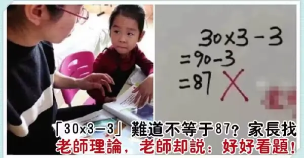 「30x3~3」原來不是等於87?家長向老師請教,老師卻指出:好好閱讀題目!