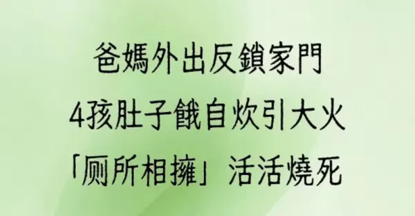 爸媽外出反鎖家門 4孩肚子餓自炊引大火!「廁所相擁」活活燒死