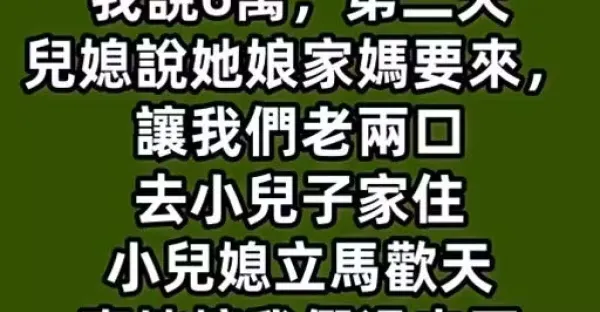 我存了60萬,大兒媳問我存了多少錢,我說6萬,第二天兒媳說她娘家媽要來,讓我們老兩口去小兒子家住,小兒媳立馬歡天喜地接我們過去了那架勢,仿佛我們多待一秒都是多餘的.......