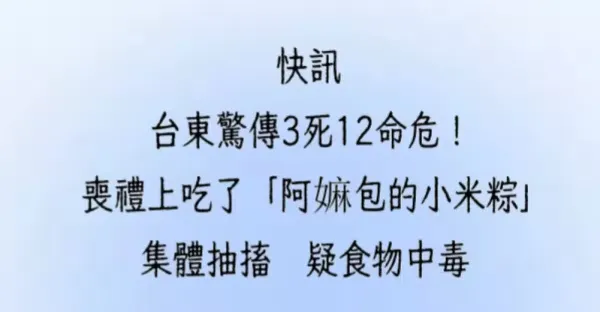 快訊/台東驚傳3死12命危!喪禮上吃了「阿嬤包的小米粽」集體抽搐 疑食物中毒