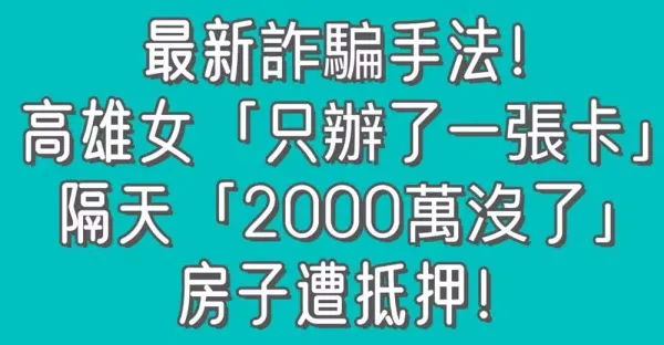 最新詐騙手法!高雄女「只辦了一張卡」...隔天「2000萬沒了」房子遭抵押
