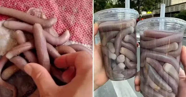 情侶拍照分享街邊「奇特飲品」,一條條粗壯物裝滿杯,網友看了連連搖頭:價格絕對不便宜