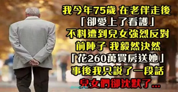 我今年75歲,在老伴走後「卻愛上了看護」遭到兒女強烈反對。前陣子,我毅然決然「花260萬買房送她」事後我只說了一段話,兒女卻沉默了...