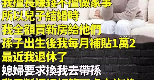 我擅長賺錢不擅做家務事!所以兒子結婚時我全額買新房給他們、孫子出生後我則是每月補貼1萬2。最近我退休了「媳婦要求換我去帶孫」我果斷拒絕,打算四處去旅遊,她卻說:「那您別後悔,我以後不能幫您養老....」 #接著我也出招了