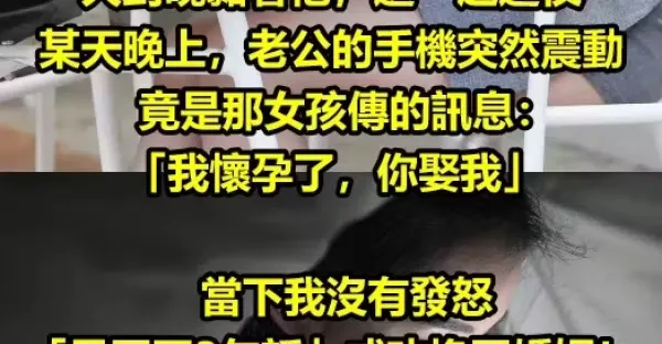 老公公司最近來了一個女新人,一天到晚黏著他,還一起過夜⋯某天晚上,老公的手機突然震動,竟是那女孩傳來的訊息:「我懷孕了,你娶我」。當下我沒有發怒「只回了3句話」,成功地挽回婚姻!!