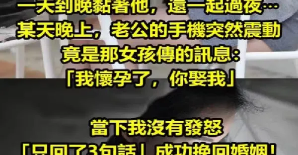 公司最近來了一個女新人,一天到晚黏著他,還一起過夜⋯某天晚上,老公的手機突然震動,竟是那女孩傳的訊息:「我懷孕了,你娶我」。當下我沒有發怒「只回了3句話」,成功挽回婚姻!