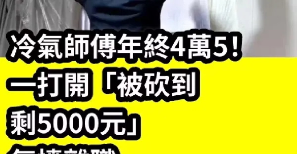 冷氣師傅年終4萬5!一打開「被砍到剩5000元」氣憤離職 曝「大扣錢原因」妻子心疼:真的欺負人
