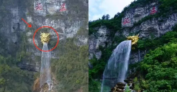貴州一懸崖上金色龍頭,常年不斷向外吐水,眾人走近一看不淡定了