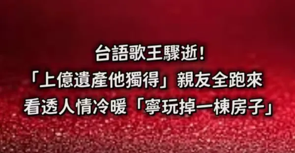 台語歌王驟逝!「上億遺產他獨得」親友全跑來 看透人情冷暖「寧玩掉一棟房子...」