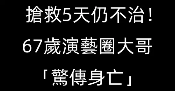 午間快訊/ 搶救5天仍不治!67歲演藝圈大哥「驚傳身亡」死因曝光