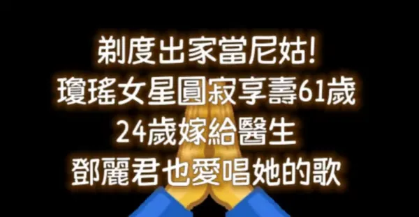 剃度出家當尼姑!瓊瑤女星圓寂享壽61歲... 24歲嫁給醫生「鄧麗君也愛唱她的歌」