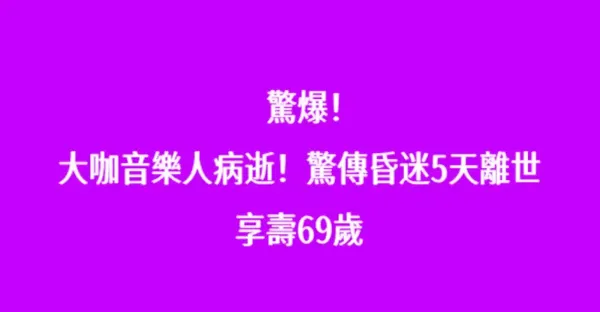 驚爆!大咖音樂人病逝!驚傳「昏迷5天離世」享壽69歲