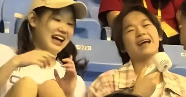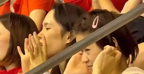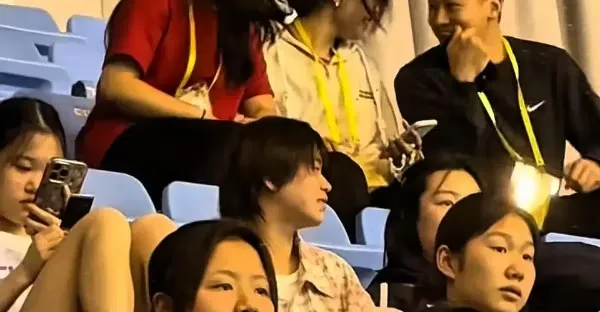 全紅嬋穿花格襯衣觀看比賽,坐在觀眾席上好像一名中學生