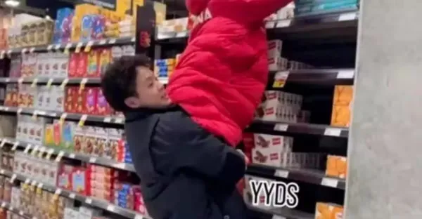 陳藝文抱全紅嬋在超市拿曲奇餅,一個大力士,一個小饞貓!