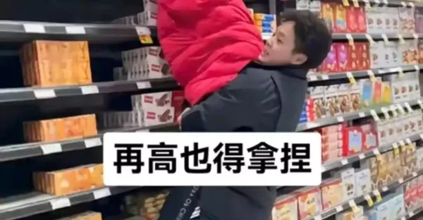 笑噴,陳藝文抱全紅嬋在超市拿曲奇餅,一個大力士,一個小饞貓!