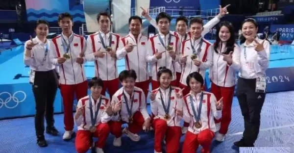 郭晶晶結束奧運工作,與中國跳水隊合影,祝賀隊員包攬所有金牌