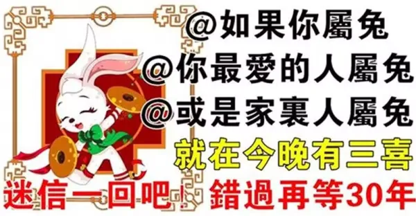 如果你屬兔,你最愛的人屬兔,或家中有屬兔的,就在今晚有三喜!