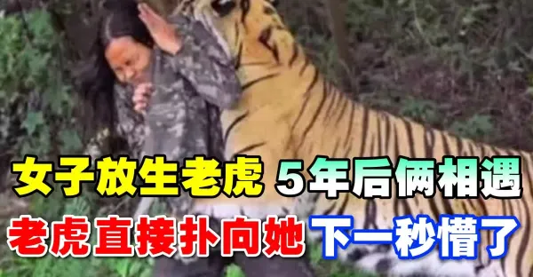 女子放生老虎,5年後人虎再次相遇,老虎直接撲上去咬住她的頭!
