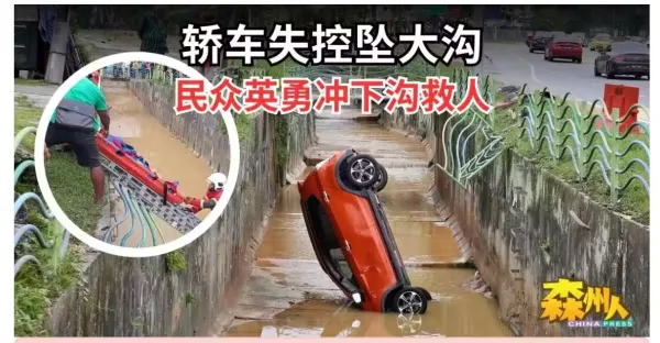 轎車失控墜大溝 民眾英勇衝下溝救人