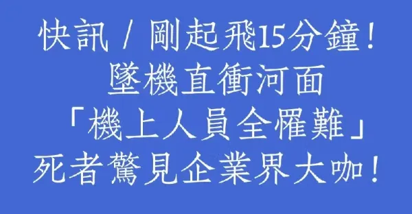 快訊/剛起飛15分鐘!墜機直衝河面「機上人員全罹難」.............死者驚見企業界大咖!