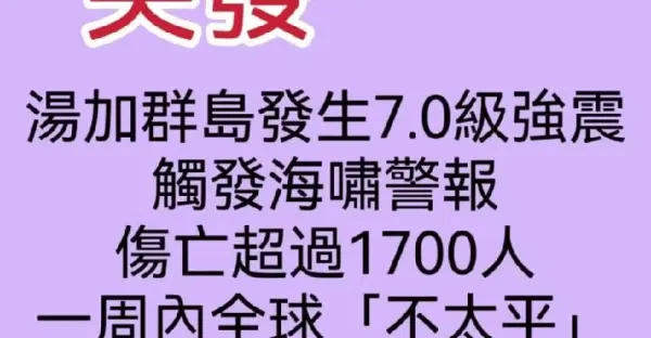 突發!湯加群島發生7.0級強震,觸發海嘯警報!傷亡超過1700人……....一周內,全球「不太平」!!!