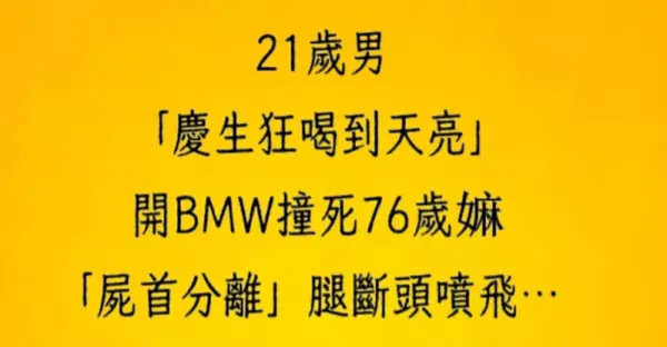 21歲男「慶生狂喝到天亮」開BMW撞死76歲老婦「屍首分離」腿斷頭噴飛……