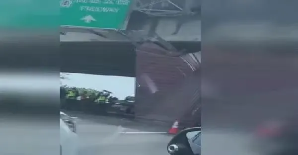 扯!20呎貨櫃突彈起「直立」卡橋墩害 國道塞爆
