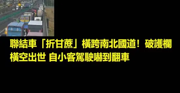 聯結車「折甘蔗」橫跨南北國道!破護欄橫空出世 自小客駕駛嚇到翻車