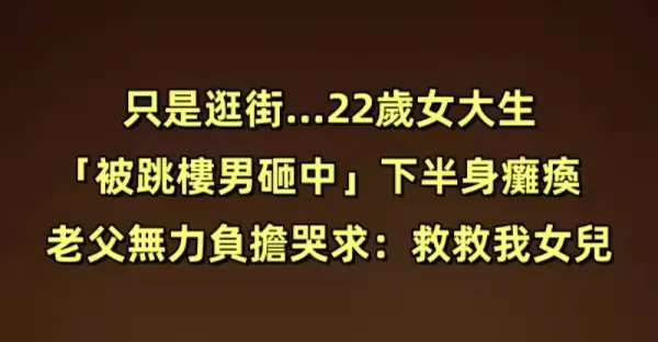 只是逛街…22歲女大生「被跳樓男砸中」下半身癱瘓 老父無力負擔哭求:救救我女兒!