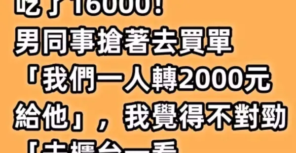 公司8人聚餐吃了16000! 男同事搶著去買單「我們一人轉2000元給他」,我覺得不對勁「去櫃台一看賬單傻眼了!」