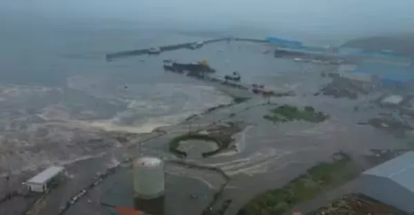 快訊/第一波海嘯到了!淹沒港口小鎮「空拍畫面曝光」