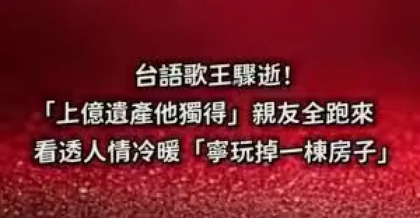 台語歌王驟逝!「上億遺產他獨得」親友全跑來 看透人情冷暖「寧玩掉一棟房子!」