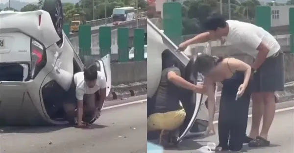 國道翻車180度!低胸妹「燦笑爬出」光腳路上跳 網封:樂天女孩