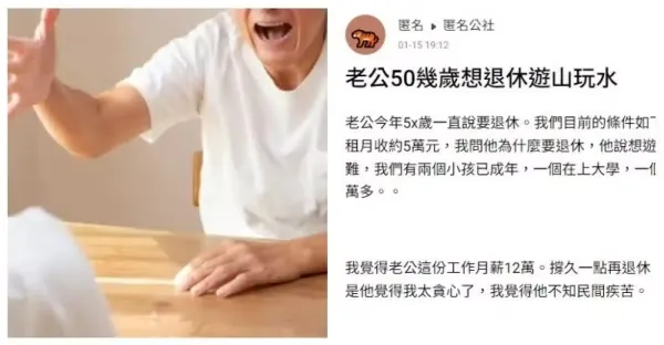 老公月薪12萬,50多歲了想退休、去遊山玩水,2孩子一個讀大學、一個在工作,但我覺得先生不知人間疾苦,再做久點對家裡更好。他卻說:「想上班妳自己去」!我現在說不動他了...