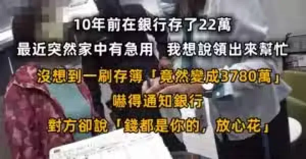 10年前在銀行存了22萬,最近突然家中有急用,我想說領出來幫忙,沒想到一刷存簿「竟然變成3780萬...」,嚇得通知銀行,對方卻說「錢都是你的,放心花!」