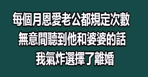每個月恩愛老公都規定次數,無意間聽到他和婆婆的話,我氣炸選擇了失婚!