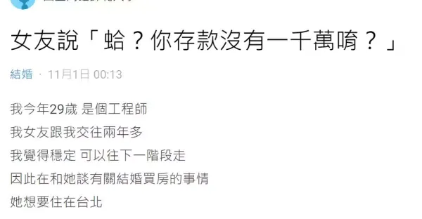 我是位29歲工程師,女友家境很好,從小就沒吃過苦,也不懂理財,最近我們有想婚念頭,但她想買在台北,一聽到我存款數字後,竟然直接:「蛤?你存款沒1000萬喔」,之後反應更讓我心寒😫😫...