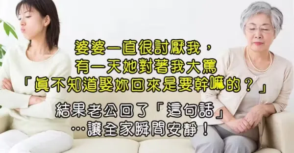 婆婆一直很討厭我,有一天她對著我大罵「真不知道娶妳回來是要幹嘛的?」結果老公回了「這句話…」讓全家瞬間安靜!