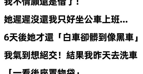 同學跟我借車「載公公去看病」我不情願還是借了! 她遲遲沒還我只好坐公車上班...6天後她才還「白車卻髒到像黑車」我氣到想絕交!結果我昨天去洗車「一看后座置物袋」立刻從憤怒變愧疚